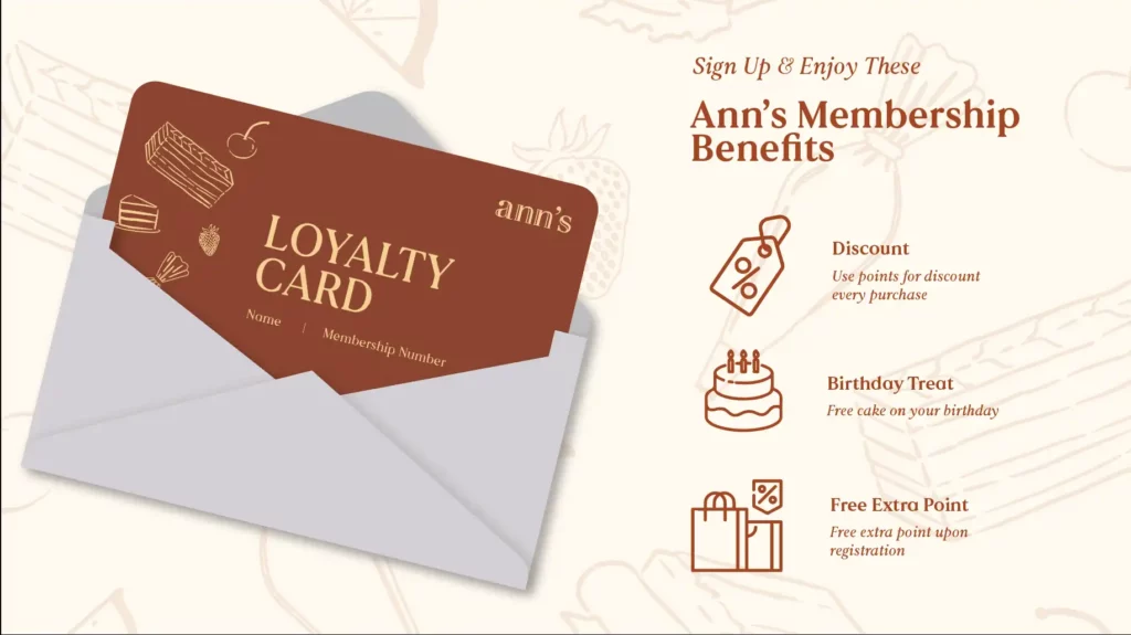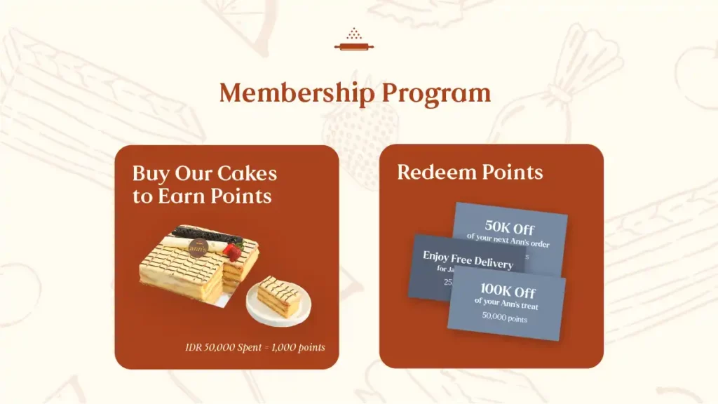 Program membership Ann’s adalah bentuk apresiasi dari Ann’s Bakehouse & Creamery untuk pelanggan setia yang sudah rutin memesan kue favorit mereka secara online. Dirancang sebagai program loyalitas pelanggan, sistem ini memberikan reward dalam bentuk poin yang bisa dikumpulkan dan ditukar dengan berbagai macam keuntungan. Melalui sistem ini, kalian bisa mendapatkan hadiah eksklusif dari setiap aktivitas belanja, bahkan hanya dengan mendaftar pertama kali di website kami.
